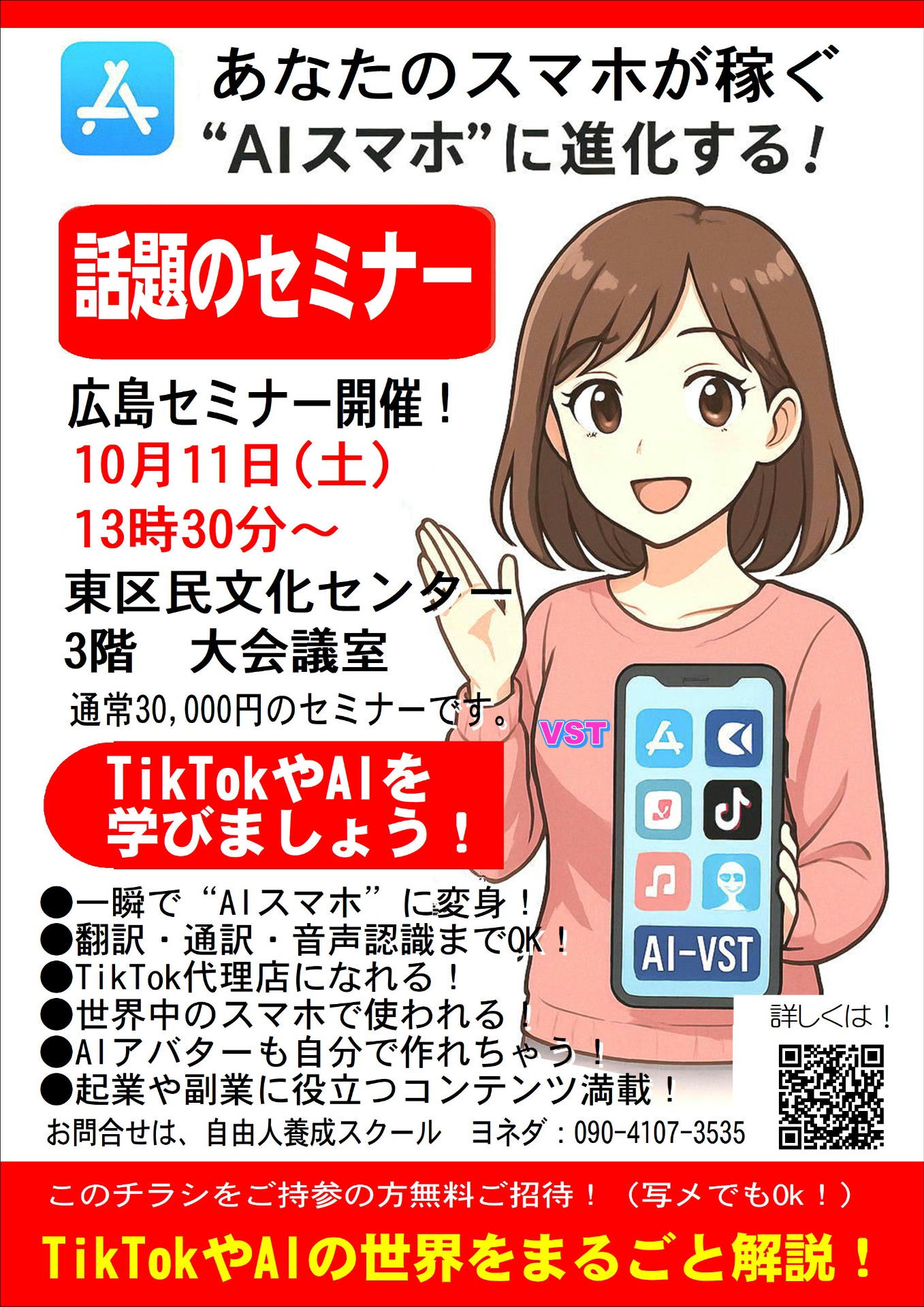 「自分のスマホをAIにしたい」「TikTokで稼ぎたい」「ビジネスを加速させたい」という方にはまたとないチャンスです。3万円相当の価値あるセミナーです。